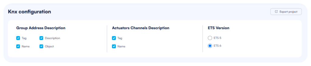ElauPro allows you to export your configuration to ETS (Engineering Tool Software) and import KNX group addresses. This section explains how to configure KNX settings, export your project to ETS, and import group addresses from your ETS project.