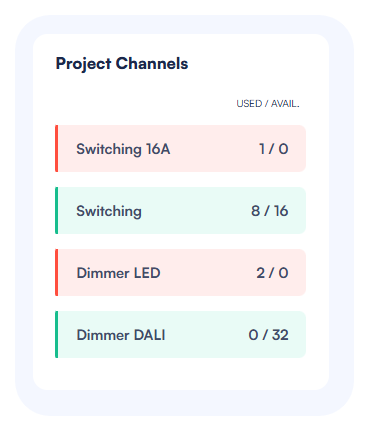 Important: Monitor the “Project Channels” section to ensure you have enough channels of each type to support all your devices. If you need more channels, you can add extensions to your master actuators or add additional master actuators to your panel.