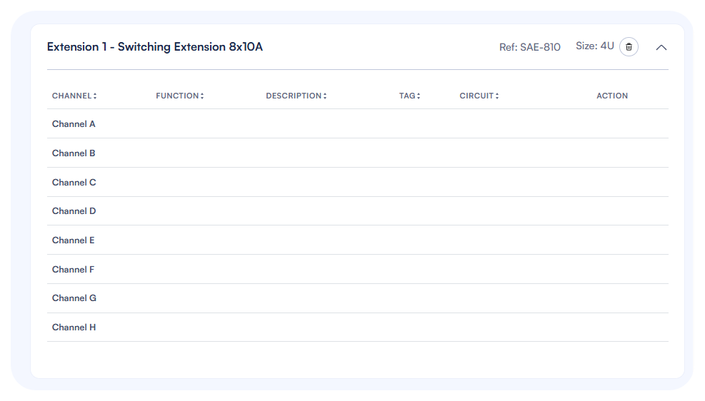 • Each channel has a Circuit column where you can add the electrical circuit number.