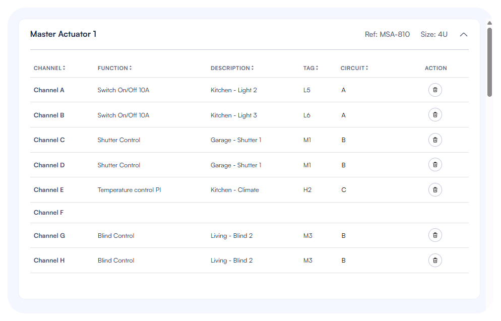 • Click on a master actuator reference in your panel list to access the output configuration page.