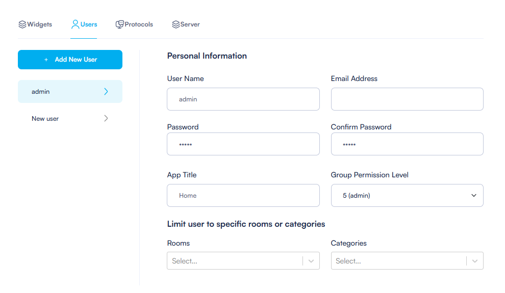 Tip: Creating users with specific room and category restrictions is useful for guest access or when different family members or employees need access to different parts of the building.