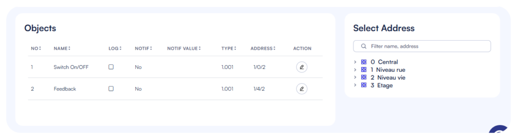 • The address selector on the right allows you to browse and select from available KNX group addresses (after importing the group addresses in the KNX section)