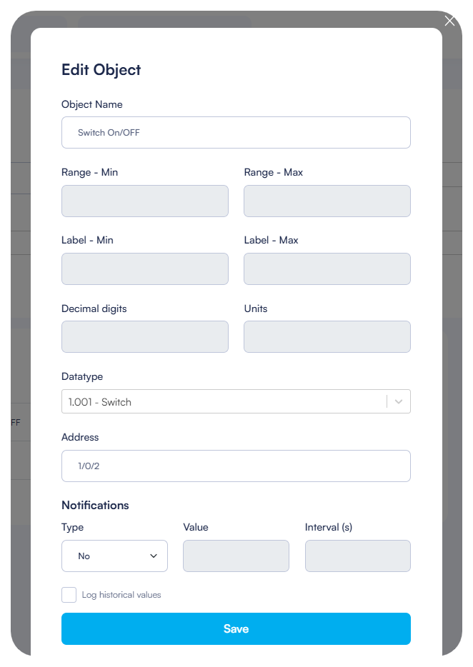 Each widget has one or more objects that define its behavior and connection to KNX group addresses: