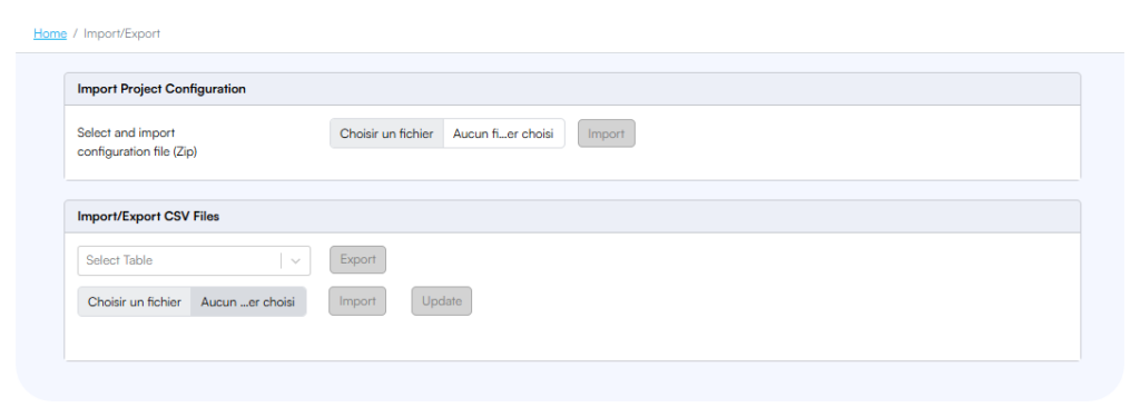 • In the “Import Project Configuration” section at the top of the Import/Export page, click “Choisir un fichier” (Choose a file)